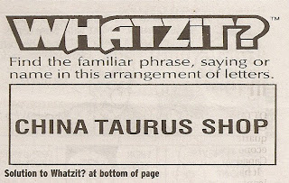 The answer to Whatzit? #9 was “Bull in a China Shop.”This was a good Whatzit puzzle! If only I had clued in that by using the word “Taurus,” they meant bull. Taurus is the second sign of the zodiac and its emblem is the bull. It wasn’t a very hard one if you knew stuff about the zodiac signs. Taurus was written between china shop, therefore you get “Bull in a china shop.” This is what a found on the internet: